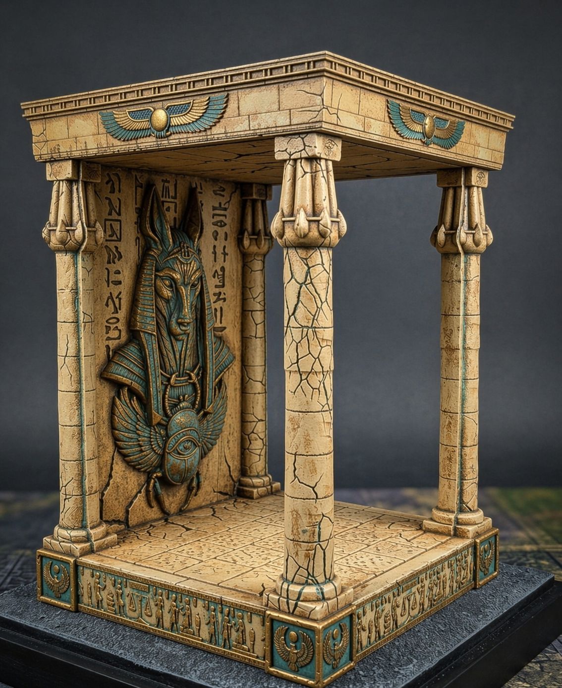 Lotus columns carved with hieroglyphic detail. An Anubis style standing guard at the corners. A decorative base built from ancient stone tiles. A matching top slab that seals the world shut.